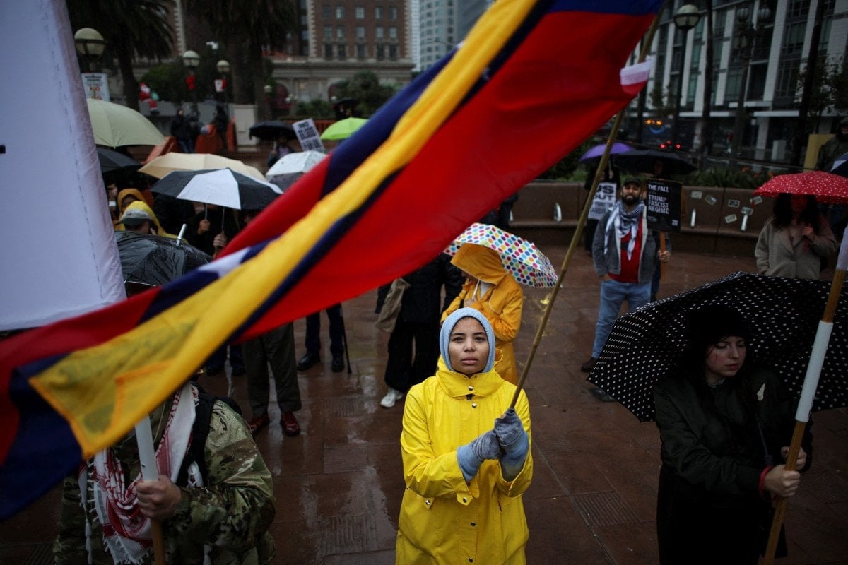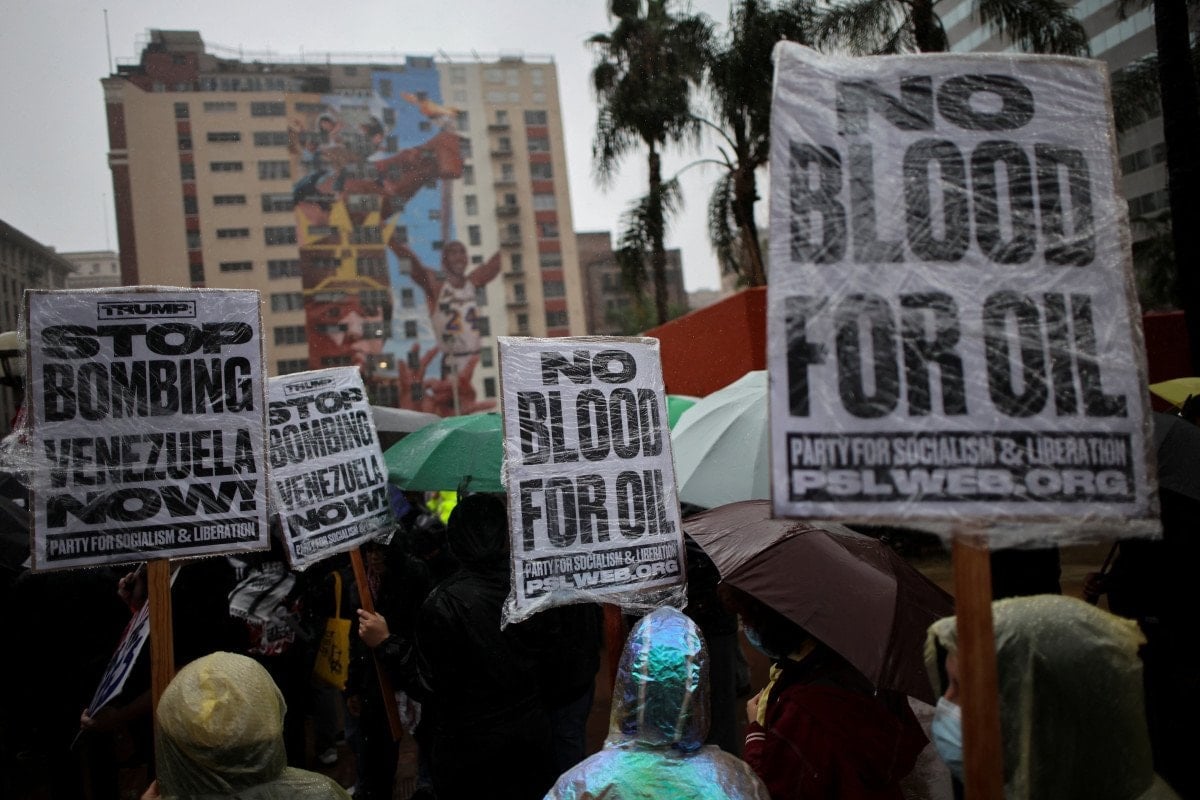 “Los Angeles, Venezuela’ya karşı savaş istemiyor” şiarıyla bir araya gelen yüzlerce kişi, yağmura aldırış etmeden şehir merkezine yürüdü. Protestolarda, ABD’nin Venezuela halkına yönelik bombalamaları ve askeri harekâtı kınandı.