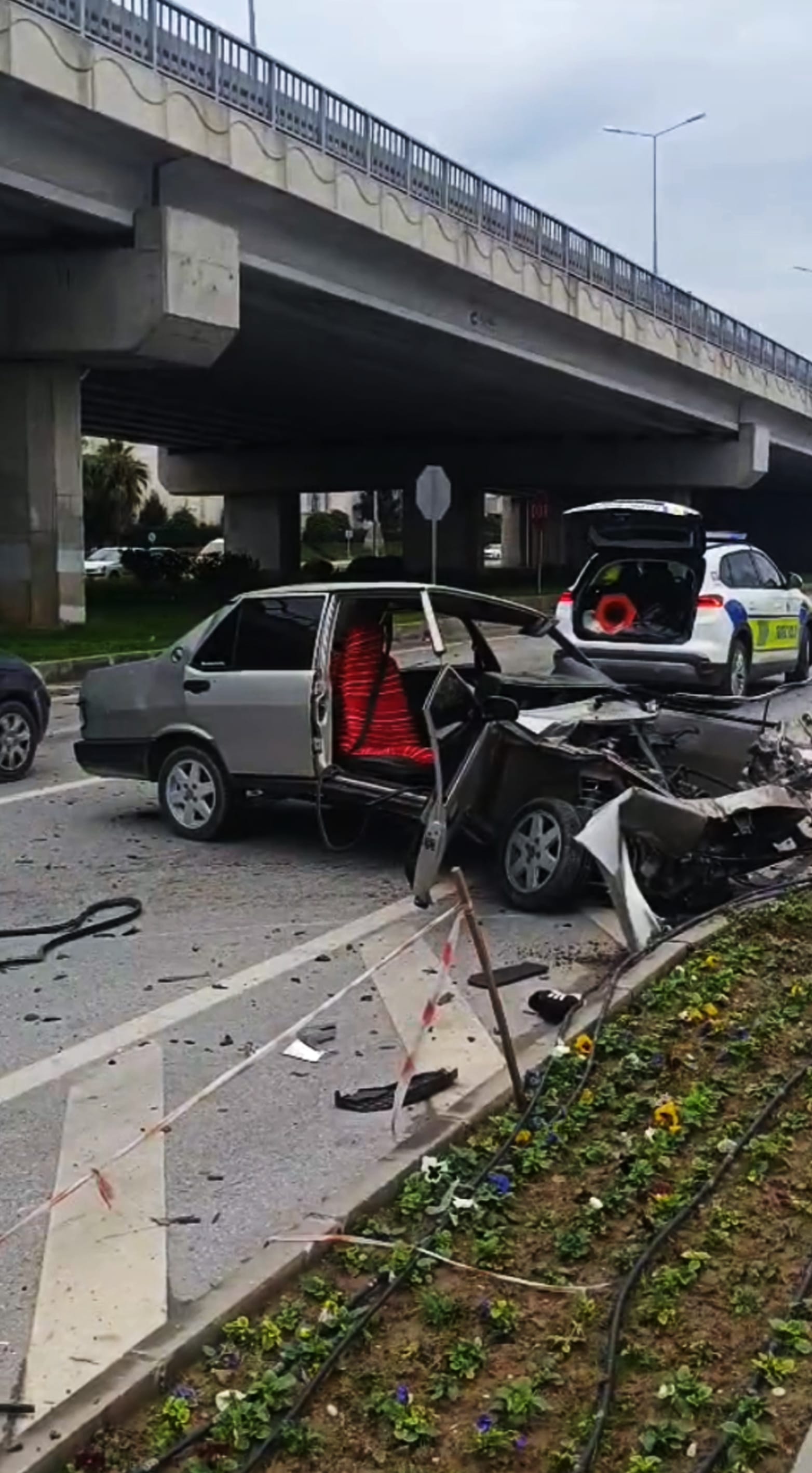 Kaza anında olay yerinde bulunan ve yol verilmek istenen ambulanstaki sağlık görevlileri, vakit kaybetmeden araçlarından inerek yaralılara müdahale etti. Hastaneye sevk edilen yaralıların hayati tehlikelerinin bulunmadığı bildirilirken, kazanın şiddeti çevreye savrulan parçalarla gözler önüne serildi. Çarpışmanın etkisiyle otomobillerden birinin direksiyonu kaza yerinin 15 metre gerisinde, aküsü ise 130 metre ilerisinde bulundu. Bölgedeki ulaşım, araçların kaldırılması ve temizlik çalışmalarının ardından yaklaşık bir saat sonra normale döndü.