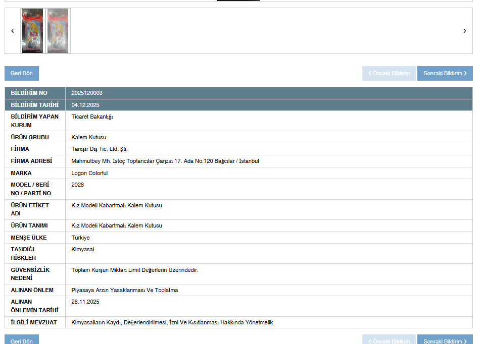 Bakanlık açıklamasında, “Kız Modeli Kabartmalı Kalem Kutusu” olarak etiketlenen ve Logon Colorful marka, 2028 model/seri numarasına sahip ürünün güvenli olmadığına hükmedildi.