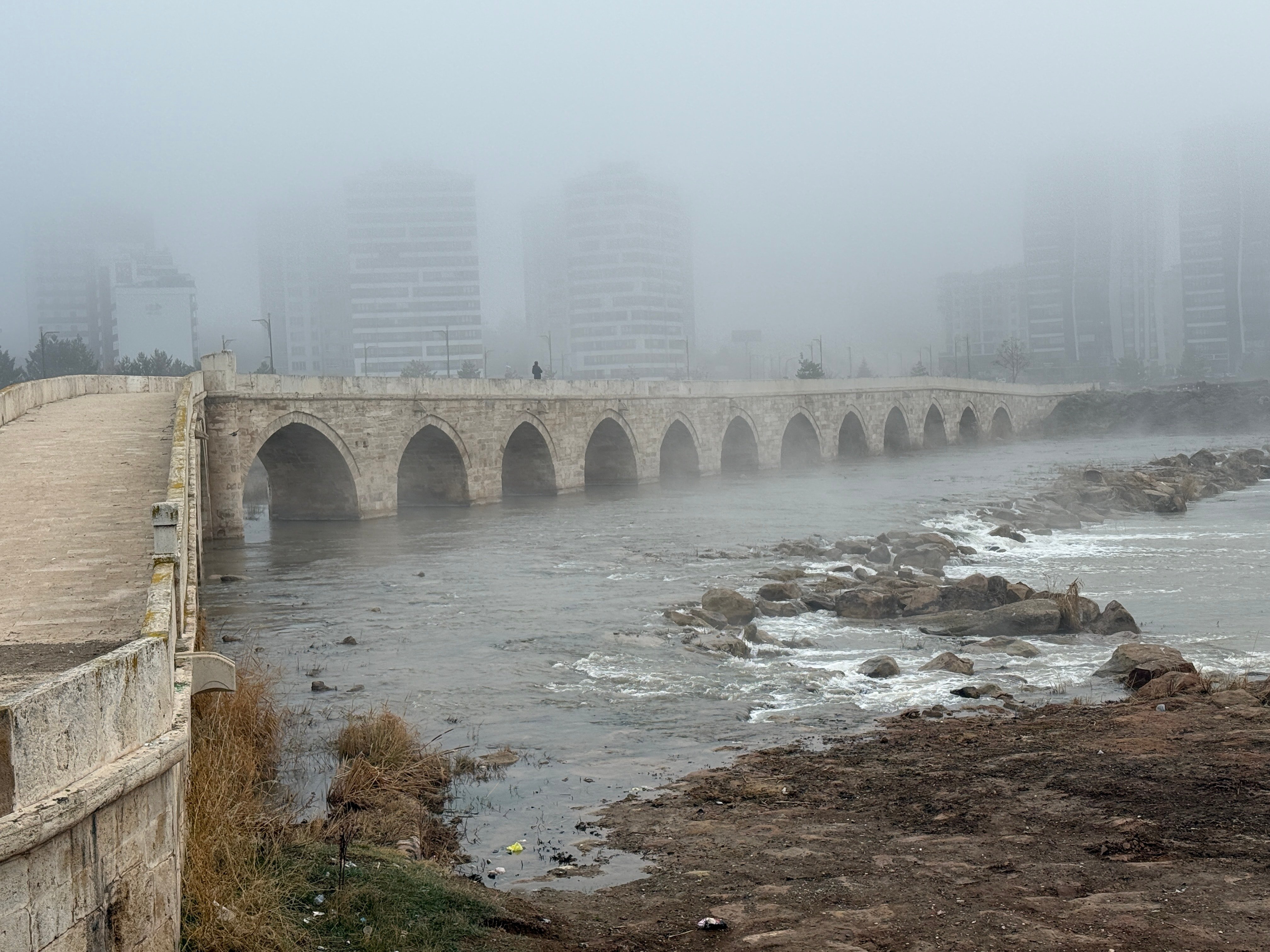Kızılırmak Nehri üzerinde bulunan tarihi Eğri Köprü civarında sis tabakasıyla birlikte güzel görüntüler ortaya çıktı.