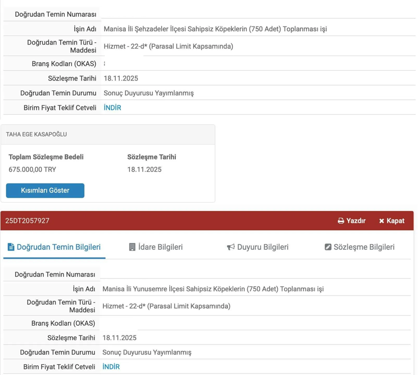 Yaptığım araştırmalar sonucu Yatırım İzleme Koordinasyon Başkanlığı da hemen vakit geçirmeden 18.11.2025 tarihinde doğrudan temin yöntemi ile Şehzadeler ilçe sınırları içinden 750 adet, Yunusemre ilçe sınırları içinden 750 adet olmak üzere toplamda 1500 adet sahipsiz köpeğin toplatılması işini TAHA EGE KASAPOĞLU adında bir şahıs firmasına verdiği gerçeği de ortaya çıktı.