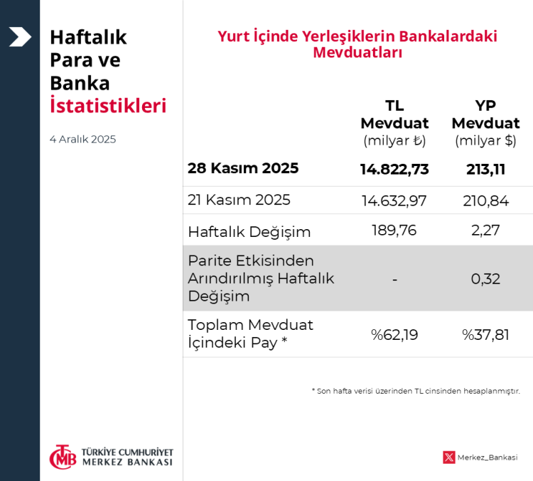 ANKARA (İGFA) – Merkez Bankası, bankacılık sektörünün mevduat, kredi ve para arzı gibi kritik göstergelerini içeren Haftalık Para ve Banka İstatistikleri’ni kamuoyuyla paylaştı.