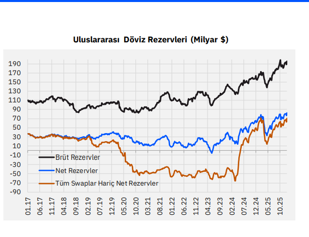 • Swap Hariç Net Rezervler: Yıl başından bugüne toplamda 16 milyar dolarlık bir iyileşme kaydedildi. Bu artışın yaklaşık 6 milyar dolarlık kısmı altın fiyatlarındaki yükselişten, 10 milyar dolarlık kısmı ise doğrudan döviz girişlerinden kaynaklanıyor.